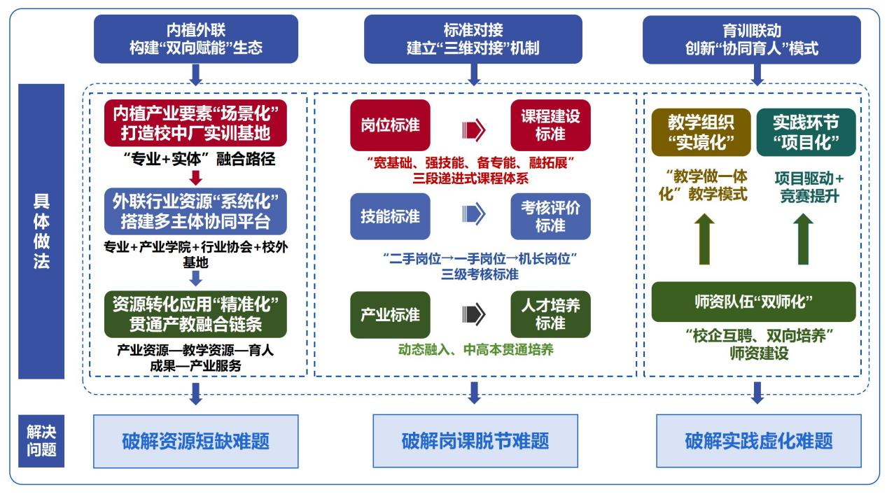 突破传统职业教育“院校办学、企业用人”的单向合作理念,提出“内植产业赋能、外联资源转化”的双向育人理念:“内植”聚焦将企业实体、生产场景、管理规范植入校内. . .