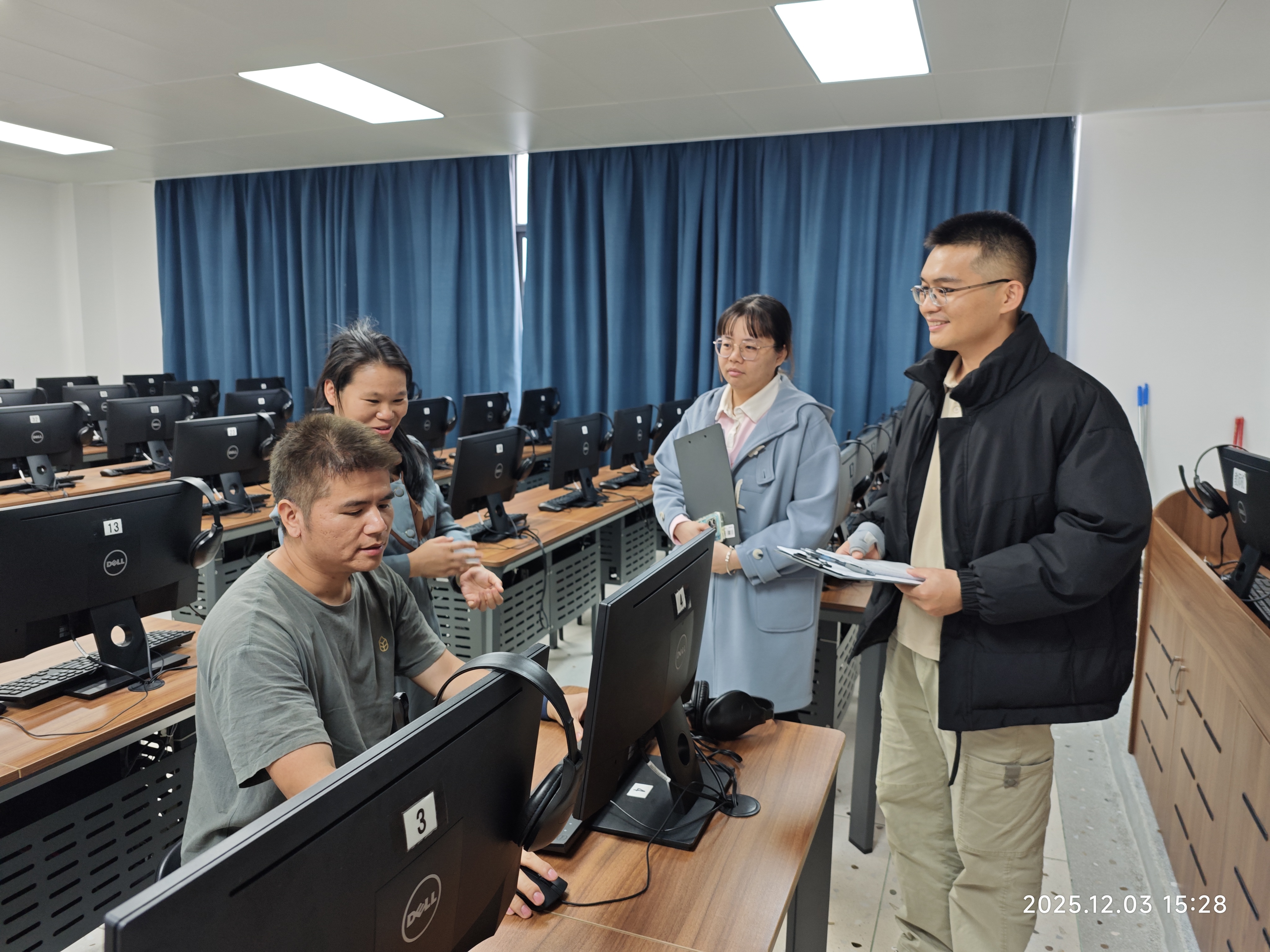 为深入贯彻落实学校2025-2026学年实践教学与实验实训室管理工作交流会精神,切实加强实训室规范管理、效能提升与长效运行保障,精准对接二级学院实践教学需求。2025年12月3日15时,实训中心副主任冯笑媚带队,维修科刘举老师以及驻滨海校区梁质丽、戴志康两名老师组成专项工作组,对该校区所有实验实训场所进行了全面细致的检查与调研。工作组一行深入滨海校区已投入使用多年的16处实验实训教学场所,包括9间公共计算机实验室、2间语音室、2间电工室以及礼仪室、物流室、制图室。检查内容系统而深入,涵盖每间实训室的具体排课与实际使用记录、设备的软硬件运行状态,以及环境卫生与安全管理状况。冯主任在检查中强调,实训室是培养学生实践能力的核心阵地,必须确保管理精细化、运行高效化、环境安全化,对发现的个别问题要求立即落实整改。