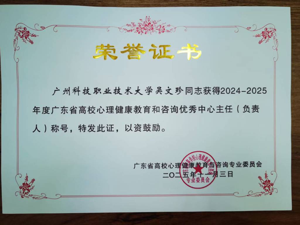 心理中心主任吴文珍凭借其出色的领导才能和对心理事业的热忱奉献,荣获 “广东省高校心理健康教育和咨询优秀中心主任” 称号。