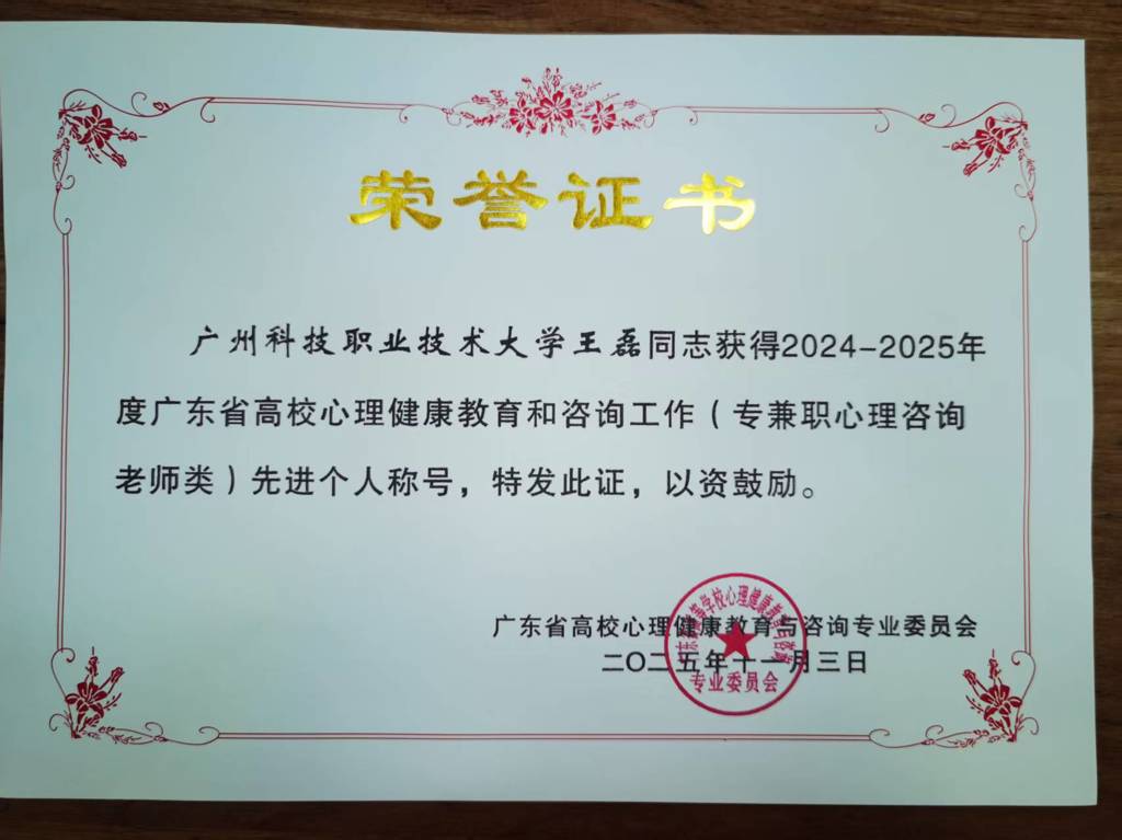 教师王磊、胡燕京因在心理健康教育、心理咨询与危机干预等一线工作中的出色表现,双双获评 “广东省高校心理健康教育与咨询工作先进个人”。